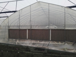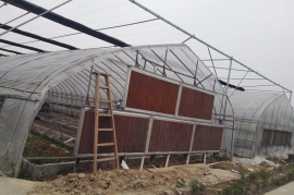 本大棚配备了风机湿帘降温系统,在大棚的一端安装风机,另一端安装湿帘,在风机的作用下,大棚外部的空气进入湿帘,穿过湿帘内部自上而下的水流时空气的温度降低,从而使大棚内部的温度降低。