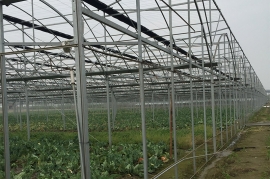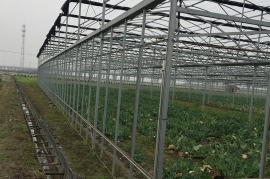 该产品由基础、框架立柱,顶部拱管三大部分组成。点式独立基础,使大棚根基牢固;立柱采用热镀锌方管,大大增强抗风抗雪强度;顶部由热浸镀锌钢管排列成平滑圆弧形,牢固兼美观。同时天沟采用2mm厚热镀锌板冷弯成型,容量大,排水及时;顶部天沟处和大棚四周均设置摇膜通风系统,是大棚内部气流通畅。此产品可根据需要实现相关配套设施,以便达到更理想的效果,如外遮阳系统、内遮阳保温系统、降温系统、加温系统、喷滴灌系统等。