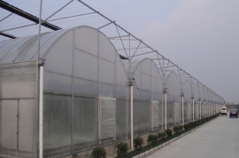 该产品由基础、框架立柱,顶部拱管三大部分组成。点式独立基础,使大棚根基牢固;立柱采用热镀锌方管,大大增强抗风抗雪强度;顶部由热浸镀锌钢管排列成平滑圆弧形,牢固兼美观。同时天沟采用2mm厚热镀锌板冷弯成型,容量大,排水及时;顶部天沟处和大棚四周均设置摇膜通风系统,是大棚内部气流通畅。此产品可根据需要实现相关配套设施,以便达到更理想的效果,如外遮阳系统、内遮阳保温系统、降温系统、加温系统、喷滴灌系统等。